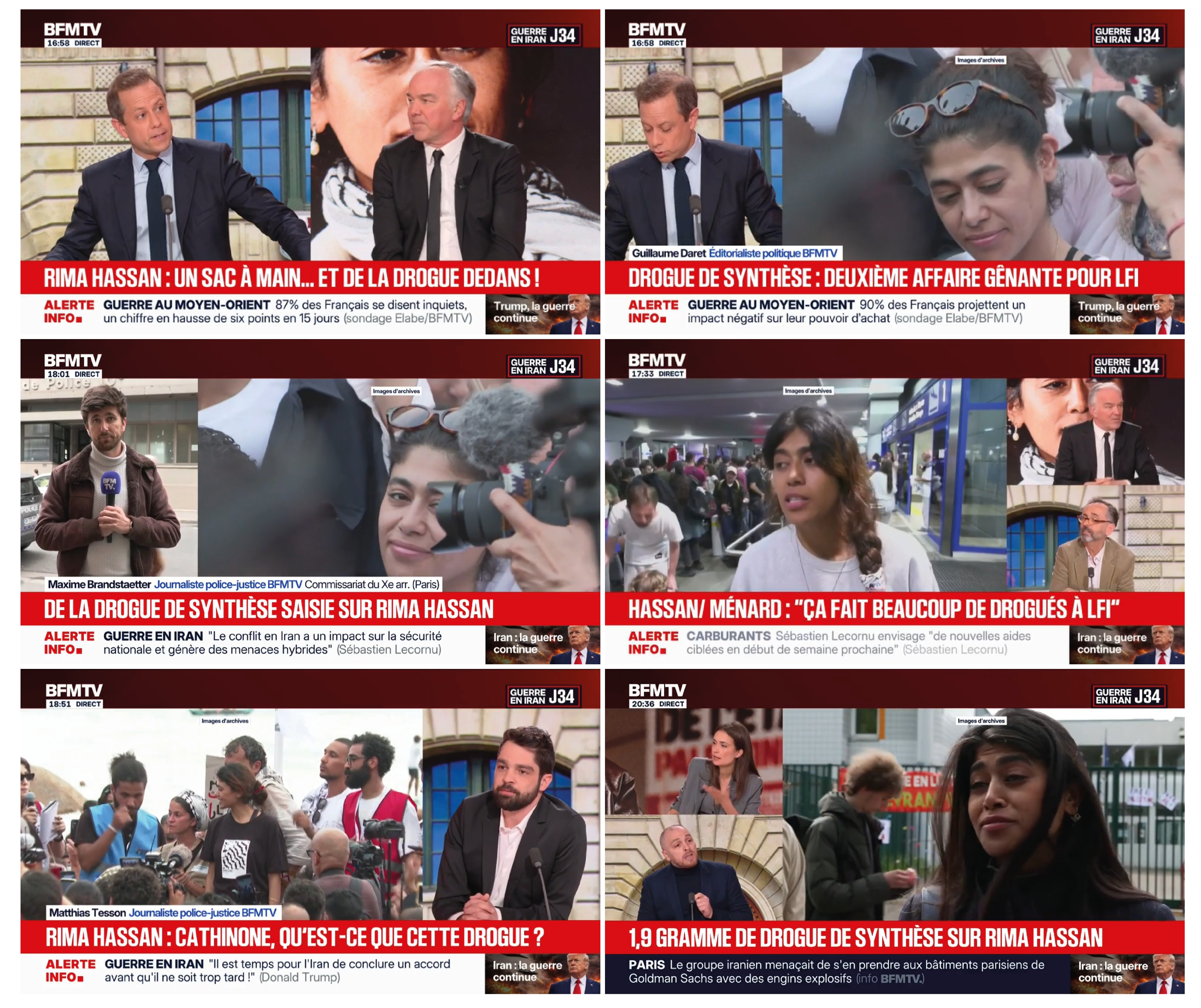 Si le vaisseau amiral du groupe Bolloré agite à l'extrême le cocktail racisme/misogynie, la quasi-totalité des médias audiovisuels sont impliqués dans l'emballement. BFM-TV, notamment, aura nourri la séquence avec roulements de tambour [3]. Les présentateurs de toutes les émissions diffusées entre 16h30 et 21h ont en effet soigné leur mise en scène : « Quand elle arrive en garde à vue, elle a ses petites affaires personnelles, et là… drogue dans le sac ! », déclare Alain Marschall. Lorsque Marc Fauvelle prend l'antenne à 18h48, le journaliste en fait sa Une : « Bonsoir à tous, ravis de vous retrouver. Une garde à vue pour apologie du terrorisme et de la drogue retrouvée sur elle. Rima Hassan, l'étoile des Insoumis au cœur de la tempête ce soir. » Idem lorsqu'à 20h18, la journaliste Julie Hammett abrège temporairement son édition spéciale sur l'Iran et s'amuse avant la page de pub : « On reviendra sur Rima Hassan qui a été placée en garde à vue pour apologie du terrorisme à Paris et qui avait pris dans son sac pour sa convocation quelques drogues de… quelques drogues de synthèse. Voilà ! "C'est ballot", dit Didier François ! On marque une courte pause, à tout de suite. »