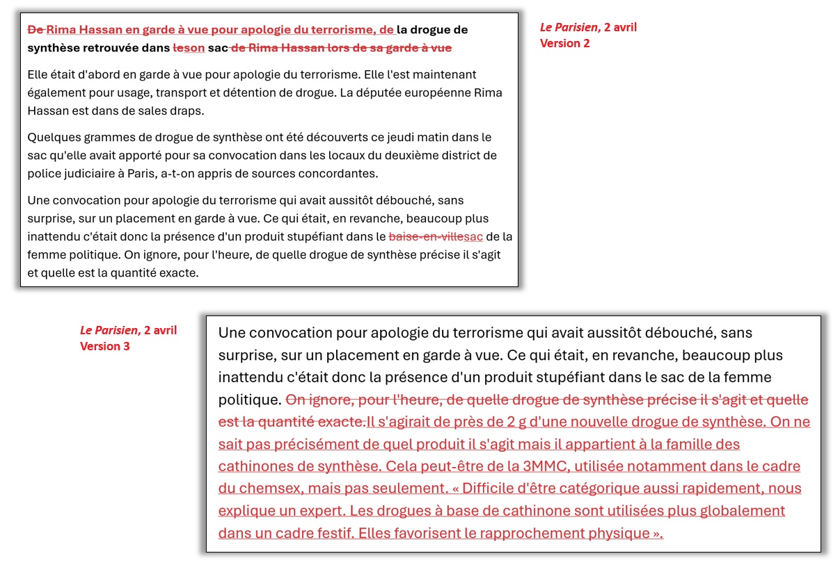 Si l'audiovisuel agit telle une caisse de résonance assourdissante, la fake news a surgi de la presse écrite, en l'occurrence d'un quotidien très en pointe dans le journalisme de préfecture [4]. Dès 12h30 le 2 avril, Le Parisien revendiquait en effet son exclusivité avec un gros titre tapageur : « Info Le Parisien. De la drogue de synthèse retrouvée dans le sac de Rima Hassan lors de sa garde à vue ». À l'origine de l'article, deux journalistes du service « police-justice », Denis Courtine et Jean-Michel Décugis. Se prévalant de « sources concordantes » n'incluant pas le parquet de Paris – dont les deux journalistes soulignent l'absence de réaction –, ces derniers sont formels et ne s'embarrassent d'aucun conditionnel :