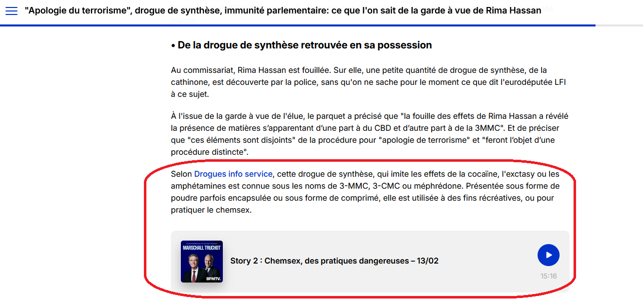 Bref, Le Parisien ne sait rien avec certitude, mais n'hésite pas à gloser sur le chemsex avec un « expert » anonyme à l'appui : non seulement le journalisme est passé par-dessus bord, mais la pratique vise ici, très clairement, à nuire doublement à la réputation de Rima Hassan. Même pratique du côté de BFM-TV. Dans un article présenté comme factuel [5], auquel contribuent pas moins de quatre journalistes « police-justice » de la chaîne et sa cheffe adjointe, BFM-TV affabule au point d'inclure, l'air de rien, un ancien podcast sur les « pratiques dangereuses » du chemsex dans le corps de l'article consacré à la garde à vue de l'eurodéputée :