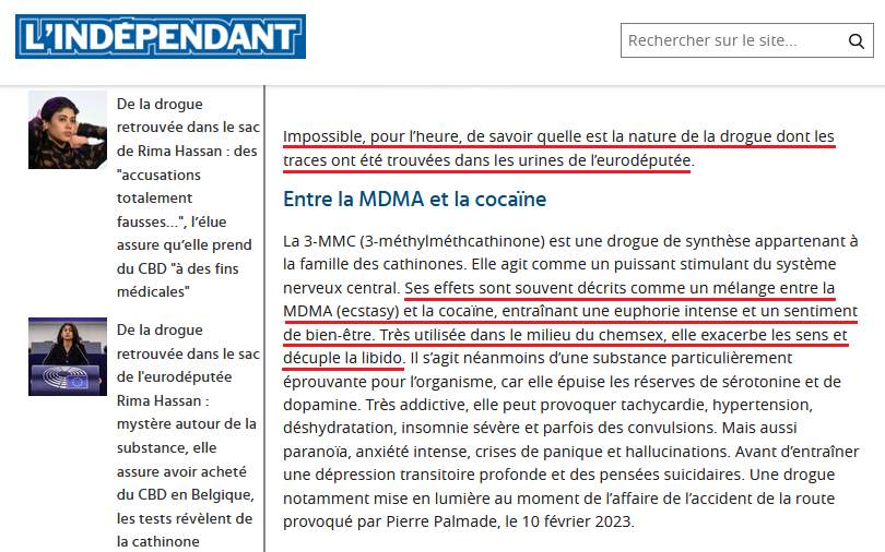 Idem jusque dans L'Indépendant, où un journaliste entretient la circulation circulaire de la fake news tout en écrivant ne rien savoir de la « nature de la drogue dont les traces ont été trouvées dans les urines de l'eurodéputée » – nous y reviendrons… –, mais en consacrant un paragraphe entier aux effets de la 3-MMC, avec les mots-clés tapageurs attendus :