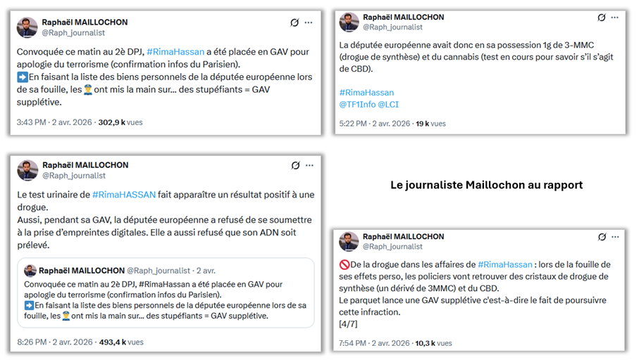 Puis, à partir de 15h43, c'est le journaliste « police-justice » du groupe TF1-LCI, Raphaël Maillochon, qui se transforme publiquement en courroie de transmission police-média. Sans aucun filtre : « En faisant la liste des biens personnels de la députée européenne lors de sa fouille, les [policiers] ont mis la main sur... des stupéfiants = GAV supplétive », écrit-il avec assurance sur X. L'inspecteur Maillochon ajoute : « La députée européenne avait donc en sa possession 1g de 3-MMC (drogue de synthèse) et du cannabis (test en cours pour savoir s'il s'agit de CBD). » Puis, il s'autocite quelques heures plus tard de manière à parfaire le voyeurisme, piétiner plus encore le contradictoire et ajouter à son tableau de chasse une autre « exclusivité » made in TF1 : « Le test urinaire de [Rima Hassan] fait apparaître un résultat positif à une drogue. » Résumons : la garde à vue est toujours en cours, mais des journalistes ont accès à des éléments particulièrement précis ne pouvant provenir que de l'intérieur du commissariat et décident de transgresser allégrement, au compte-gouttes et en direct sur les réseaux sociaux, le secret de l'instruction : présence de « stupéfiant », grammage et nature de la drogue, jusqu'au résultat du test urinaire !
