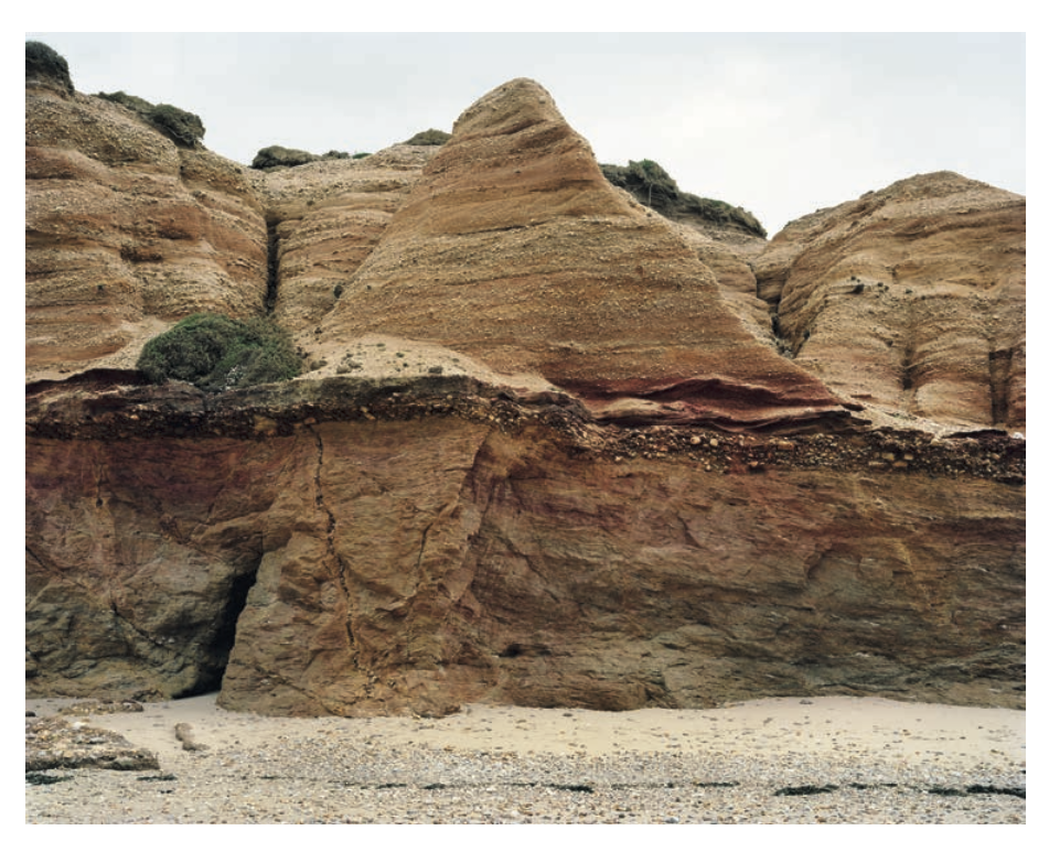 Le texte signé Philippe Bouvais est particulièrement averti des compositions que la géologie a fait naitre aux différentes périodes de formation des côtes, cet énoncé scientifique permet de qualifier ces roches que seul ce vocabulaire est en droit de nommer justement, une poétique des matières vient faire jouer très agréablement d’autres références à la description des roches et gemmes, dans la constitution d’un paysage assez brut. Est expliqué ici géologiquement la formation des couches et la spécificité de celles-ci en lien avec les périodes du Crétacé, du Mézoïque, du Cambrien, du Jurassique…. Ce qui immédiatement fait retour sur ces fragments de Côte photographiés à la chambre et aux grands formats de l’exposition, à ce fascinum qui fait photographie et qui rend compte, qui situe, qui échappe, qui enchante et ensorcelle (sens primitif de fascinum)… c’est sans doute pourquoi le mouvement qui va des rochers à l’océan nous relie à cette poétique romantique et à la suggestion de l’air, du ciel, pour assumer le voyage aux roches coupantes, le voyage de la terre et des forces herculéennes qui échappent à la représentation mais qui supposent la connaissance et le voyage..