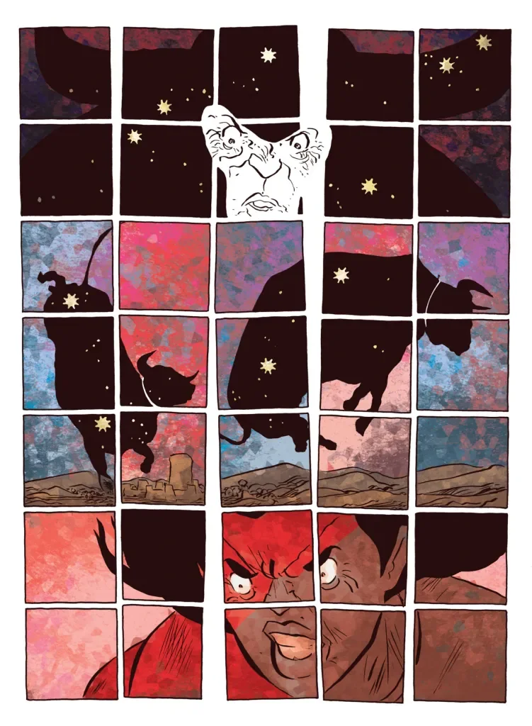 Pour son récit, le dessinateur à choisi d’utiliser peu de dialogues, de passer par des formes ou couleurs symboliques et d’offrir plusieurs sens à certains passages laissant aux lecteurices le soin d’interpréter l’œuvre. Des propositions ludiques qui rappellent les grands textes fondateurs —de l’épopée de Gilgamesh aux récits grecs des dieux de l’Olympe contre les Titans de Cronos— dont s’est inspiré Jesse Lonergan pour ce livre ; qui eux aussi, sont libres d’interprétation et évoluent fatalement selon leurs commentateurs —ne voyez dans ce coup de cœur que la mienne et reportez-vous au livre en cas de doute.
