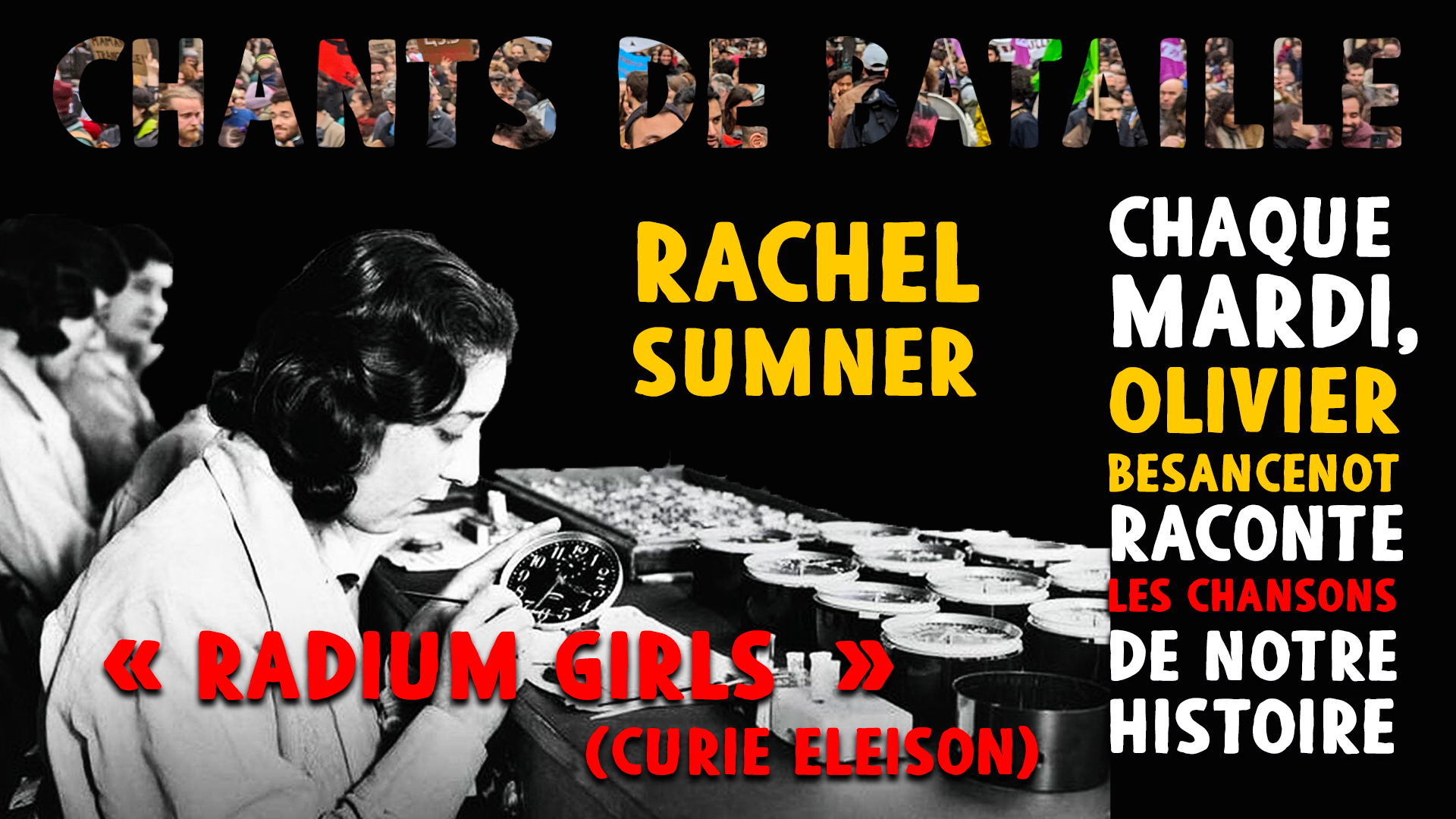 Depuis un siècle, cette histoire a été maintes fois racontée dans des livres, des films, des pièces de théâtre et même des bandes dessinées. L'histoire des « Radium Girls », ces ouvrières embauchées à partir de 1917 par l'entreprise United States Radium Corporation pour appliquer une peinture luminescente sur les aiguilles des montres. Ce que ne savaient pas ces filles, c'est que la peinture fabriquée avec du radium était extrêmement toxique… Il ne manquait qu'une chanson pour transmettre la mémoire de la lutte des « Radium Girls » pour leur survie et contre leur employeur : la chanteuse américaine Rachel Sumner vient combler ce manque avec cette magnifique chanson que vous raconte cette semaine Olivier Besancenot.