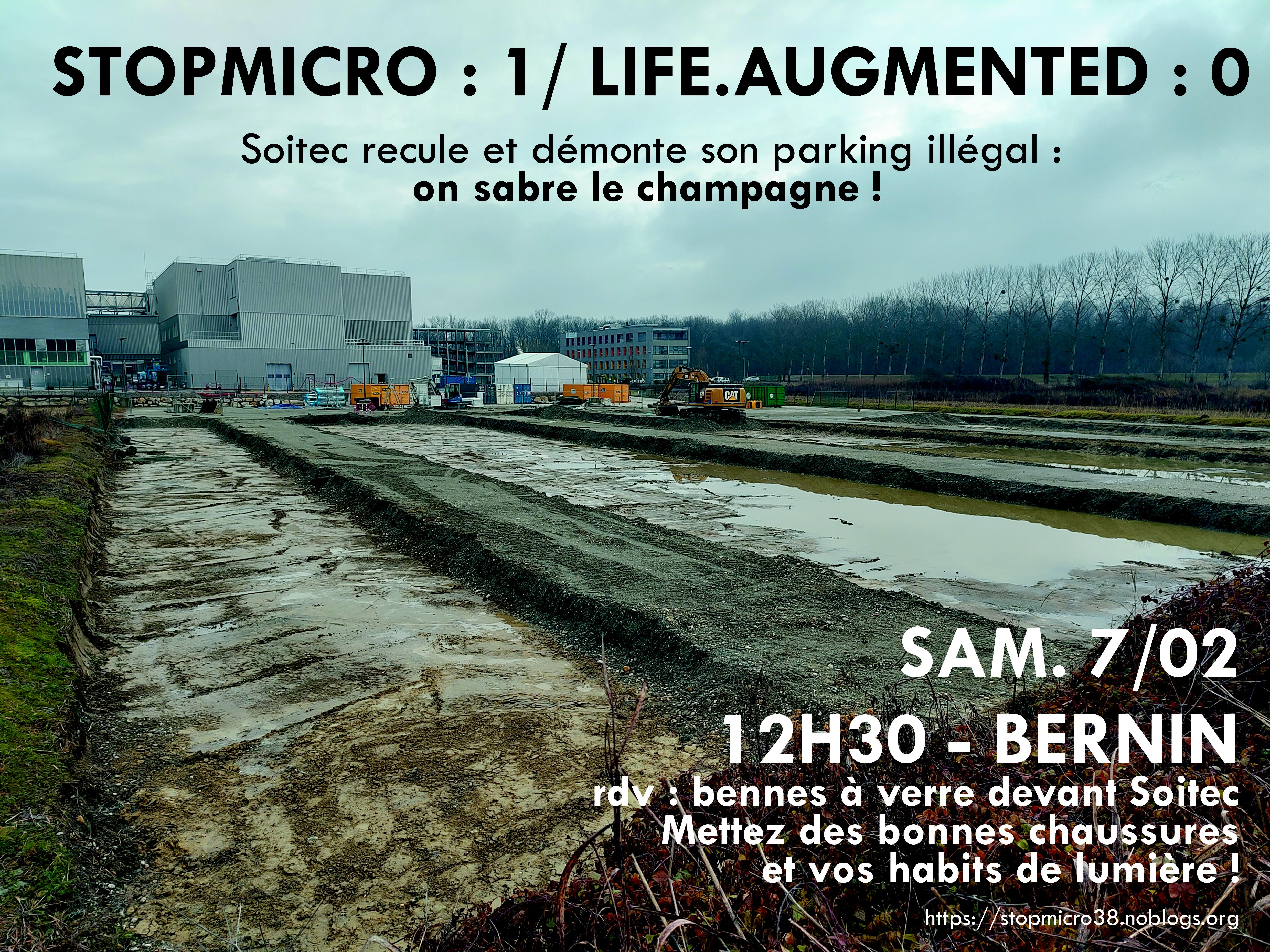 Fin novembre 2025, le collectif STopMicro révélait que l'entreprise Soitec (basée à Bernin, 38) utilisait illégalement 7 000m2 de terres agricoles pour un usage de parking, au mépris total du règlement d'urbanisme de la commune. En parallèle, le 24 septembre, des particuliers signalaient cette infraction à la commune, instance chargée de faire respecter le plan local d'urbanisme.