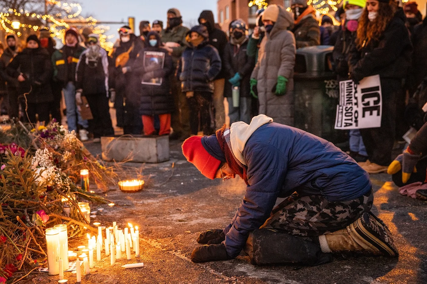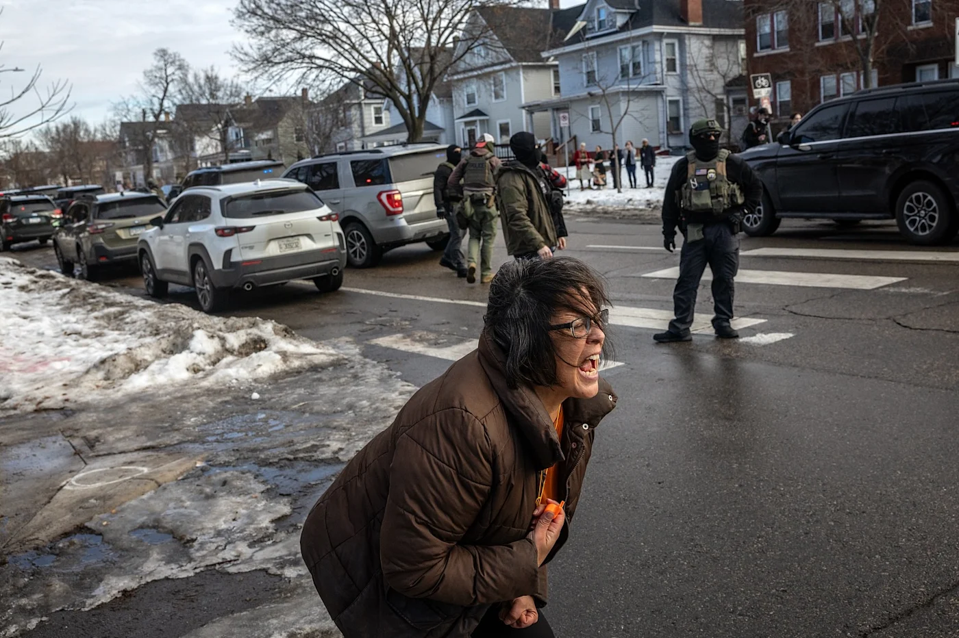 C'est peut-être vrai en une sorte de sens spirituel – dans l'esprit de politiciennes progressistes convaincues, au plus profond de leur cœur, qu'ICE n'a rien à faire ici. Et pourtant, si vous permettez que des atrocités soient commises devant vous et que vous ne faites rien de conséquent pour les arrêter mis à part prononcer un discours un peu ferme et peut-être déposer une plainte faiblarde ou deux, est-ce que vous n'êtes pas, en fait, en train de céder spirituellement aussi ? Ce mensonge est devenu le refrain courant des politiques locales. Le maire l'a dit. Le gouverneur aussi. Et, même clairement « non bienvenu », ICE a fait son nid. Les mercenaires déambulent dans les rues. Ils défoncent les portes des gens, assurés par leurs supérieurs qu'ils n'ont pas besoin de mandat de perquisition signé par un juge. Cet ordre est clairement illégal mais ça n'a plus l'air d'avoir de l'importance [11]. Les seules forces qui se mobilisent un tant soit peu contre cette invasion sont des personnes ordinaires, risquant l'emprisonnement, la mutilation et la mort, pour faire face aux hommes armés envoyés pour emmener leurs voisines dans des camps d'enfermement. Des réseaux robustes de défense des communautés se tissent à travers la ville glacée, ancrés dans l'infrastructure mise en place précisément par les infatigables « extrémistes de gauche » par lesquels le régime semble être si troublé. Grâce à ces réseaux, les mercenaires peuvent rarement se déplacer sans être pistés, rarement faire un arrêt sans être encerclés et rarement agir sans être filmés.