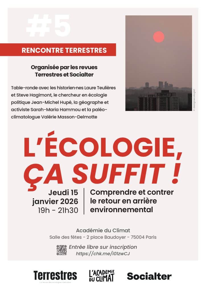 Table-ronde le jeudi 15 janvier 2026 avec la paléoclimatologue Valérie Masson-Delmotte, la géographe et activiste Sarah-Maria Hammou, les historien·nes Laure Teulières et Steve Hagimont et le chercheur en écologie politique Jean-Michel Hupé. Une rencontre organisée par Terrestres en partenariat avec Socialter, autour du livre Greenbacklash. Qui veut la peau de l’écologie ? (Seuil, 2025), à l’Académie du Climat à Paris (19h00-21h30).