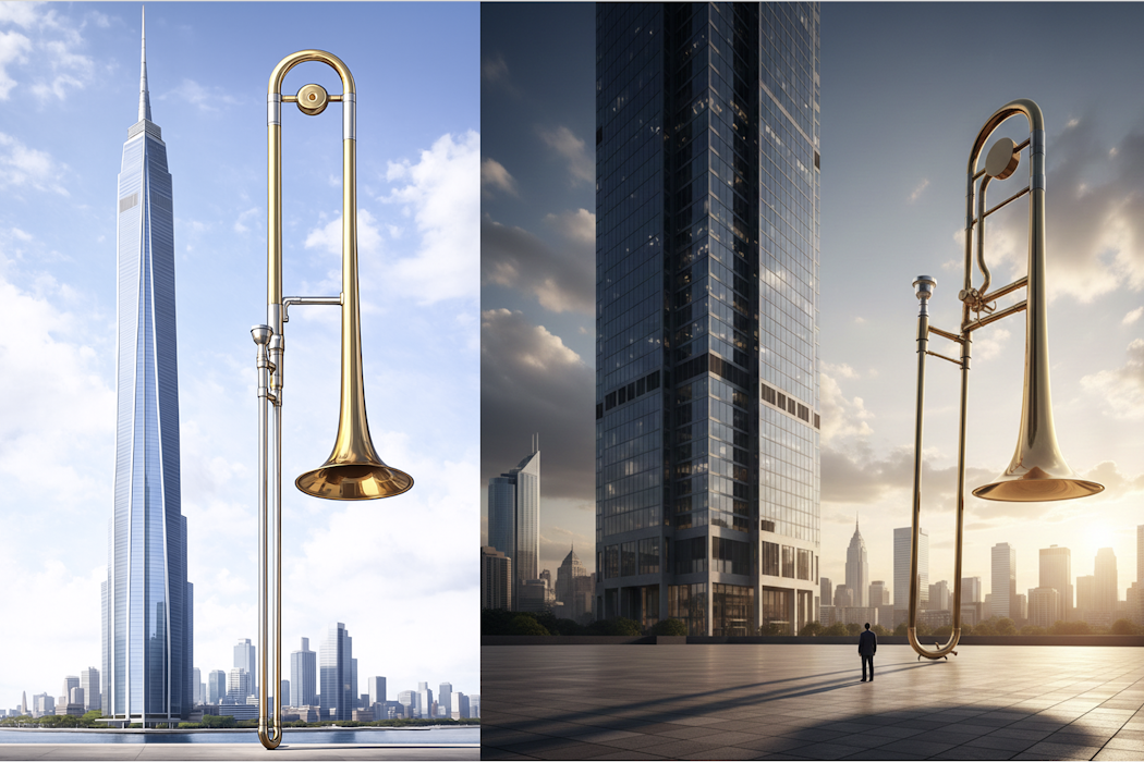 À l’image des physiciens, je vais donc simplifier le problème et considérer que nous avons affaire à un modèle de diffusion. Ces modèles sont entraînés sur des paires images-textes. Donc on peut penser que les modèles de Gemini et de Mistral ont été entraînés sur des dizaines (des centaines ?) de milliers de photos et d’images de gratte-ciel (ou de porte-avions) d’un côté, et sur une grande masse d’exemples de trombone à coulisse (ou de bananes) de l’autre. Typiquement des photos où le trombone à coulisse est en gros plan. Il est très peu probable que, dans le matériel d’apprentissage, ces deux objets soient représentés ensemble. Donc le modèle n’a en fait aucune idée des dimensions relatives de ces deux objets.