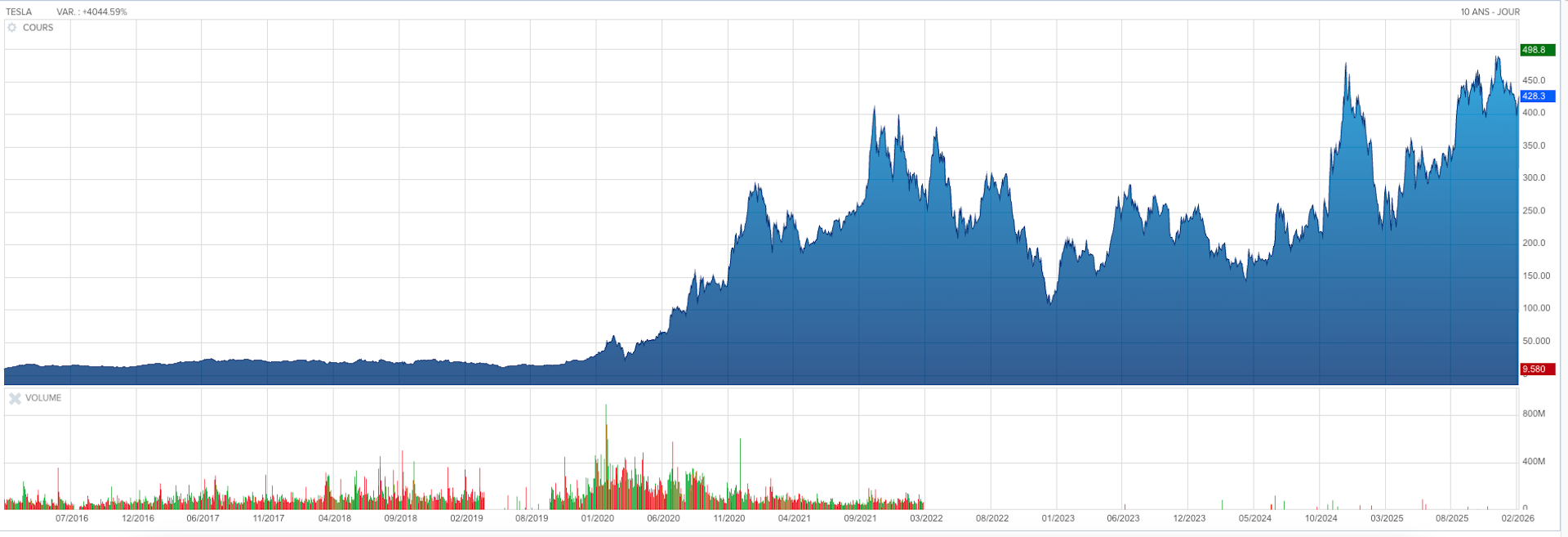 L’évolution de long terme du cours de l’action Tesla permet d’illustrer ce phénomène. Malgré des phases de pression sur les marges, de concurrence accrue et de ralentissement industriel, la trajectoire boursière reste exceptionnellement élevée comparée aux standards du secteur automobile. En février 2025, une action d’échange à 428,60 dollars états-uniens, soit 360,59 euros.