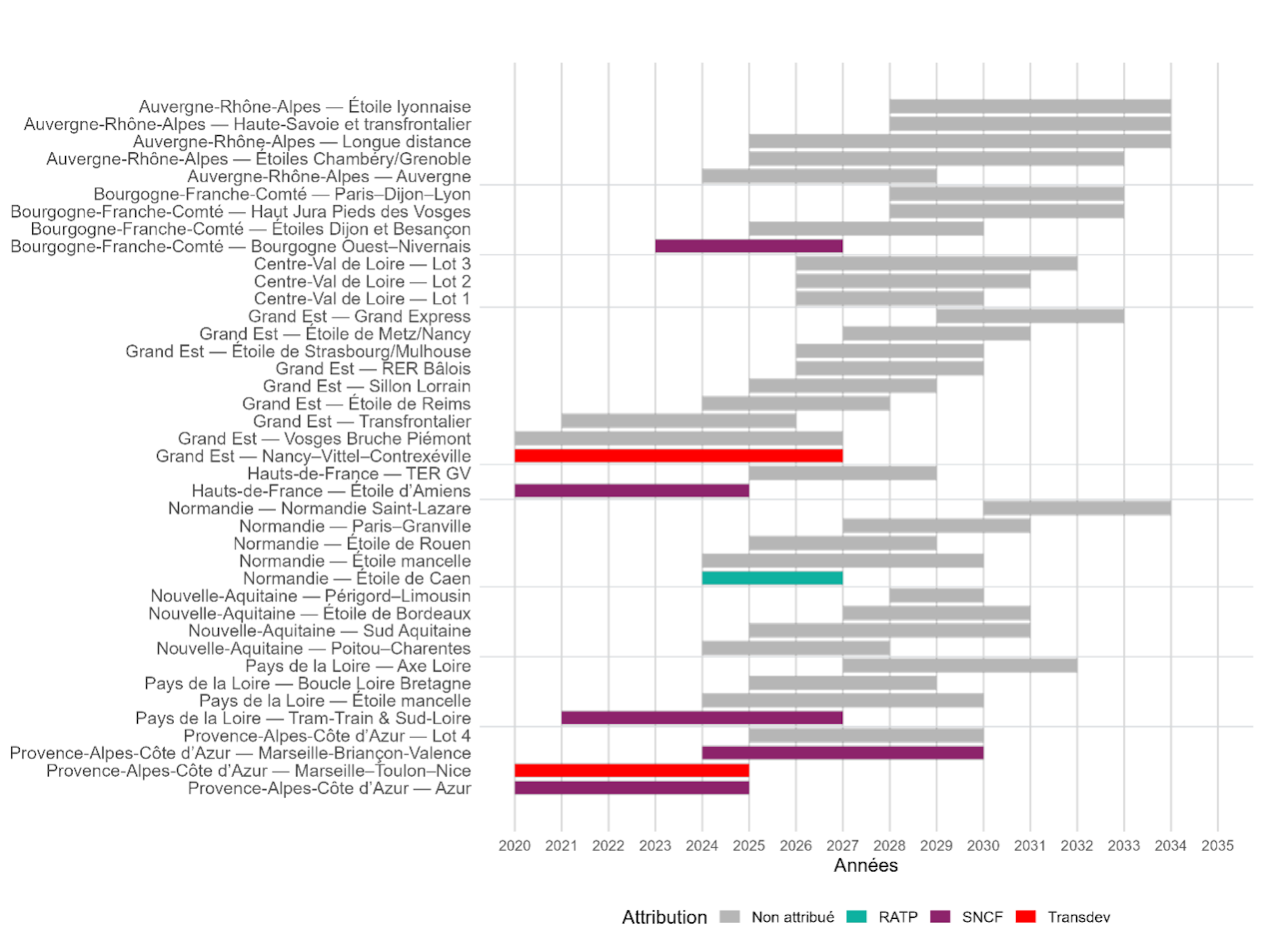 Jusqu’alors assuré sur l’ensemble des Régions par la SNCF, le service TER est aujourd’hui attribué par des contrats d’exploitation (des lots) qui doivent faire l’objet d’une mise en concurrence. L’arrivée de nouveaux opérateurs, dont certains sont déjà attributaires de lots (voir figure ci-dessous), amorce une recomposition du paysage ferroviaire public.