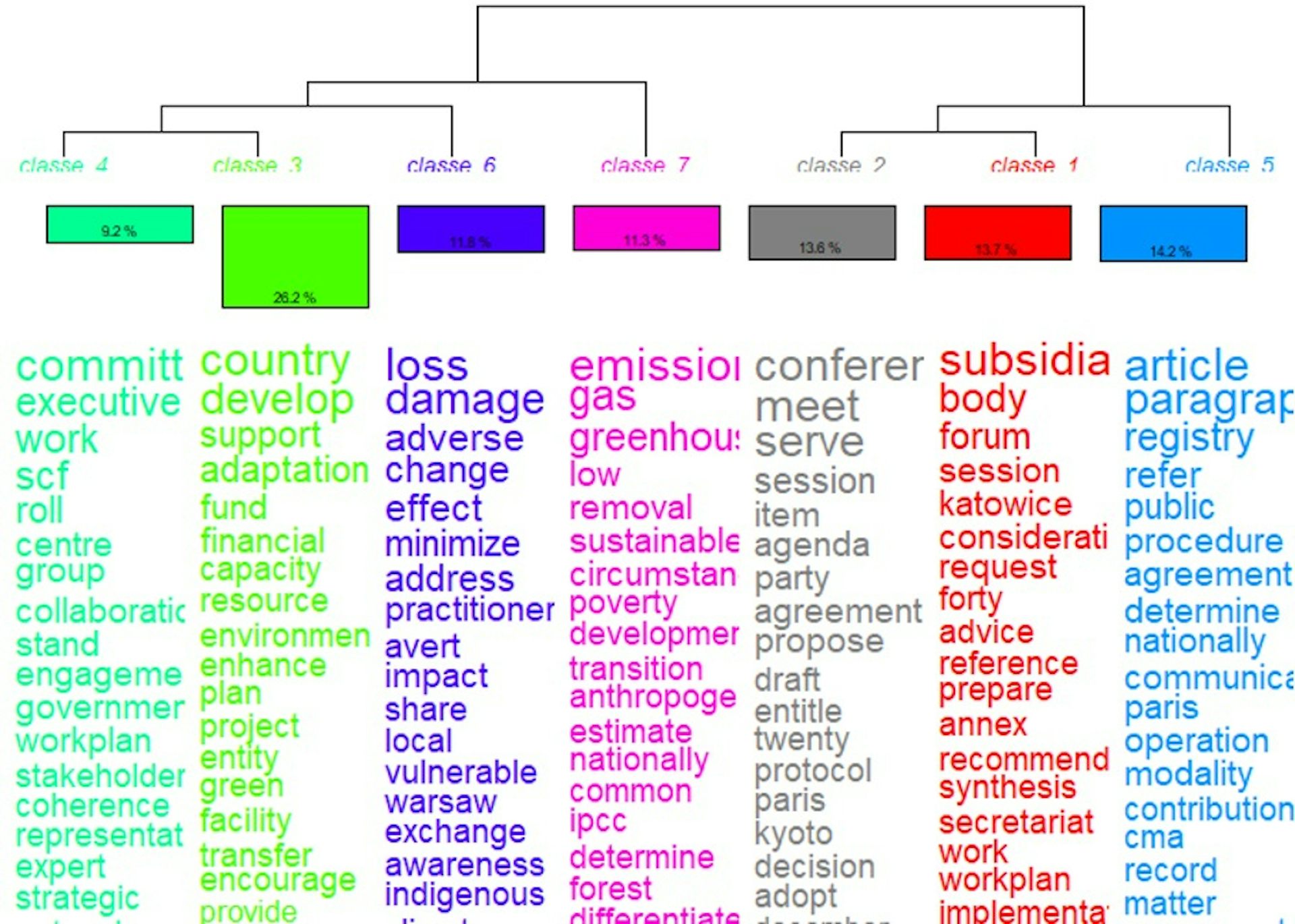Textes des COP (14,2 %, en bleu, classe 5). Cette catégorie intègre les passages qui évoquent le fonctionnement des COP elles-mêmes et des leurs organes administratifs, dont les objectifs sont actés grâce aux textes.