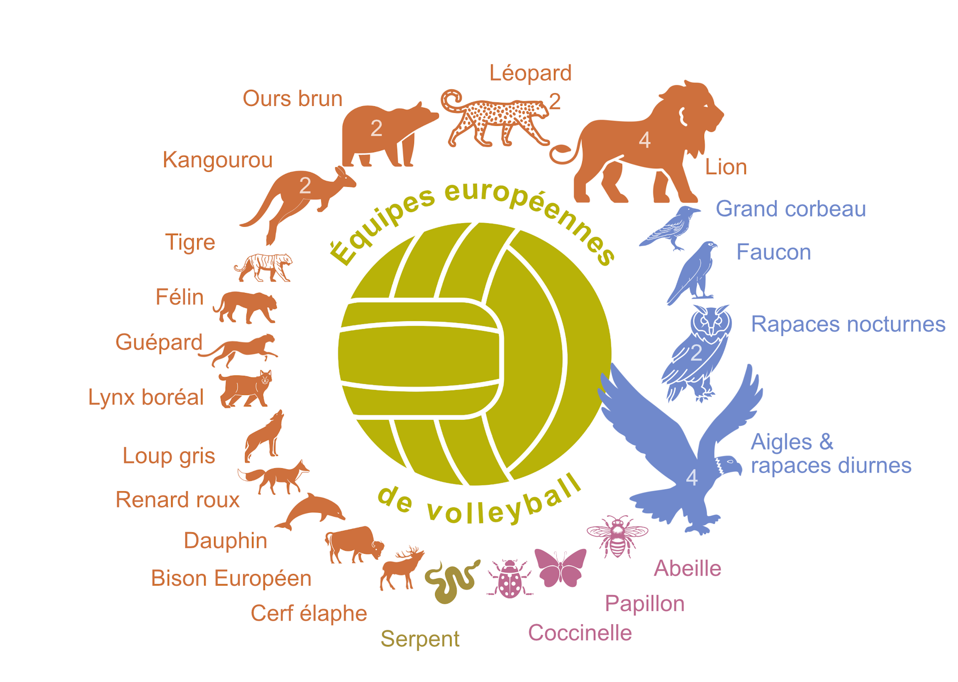 Or, la France aussi possède une faune diverse, avec plus de 20 espèces représentées dans plus de 45 clubs professionnels : les aiglons de l’OGC Nice (football), le loup du LOU Rugby (rugby), ou les lionnes du Paris 92 (handball) en sont de beaux exemples. C’est également le cas pour le volley-ball, comme le montre l’illustration ci-dessus.