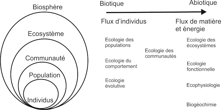 Enfin, l’écologie des écosystèmes est proche de l’écologie fonctionnelle puisqu’elle étudie la manière dont ils fonctionnent. Un écosystème comprend à la fois l’ensemble des populations en interaction dans un lieu donné et leur milieu physico-chimique (sol, climat…). Il s’agit donc d’intégrer tous les types d’interactions écologiques entre populations ainsi qu’entre elles et leur milieu physico-chimique, et de comprendre comment cela détermine les propriétés émergentes des écosystèmes, telle que leur production primaire. Là où l’écologie des populations est focalisée sur les individus, l’écologie fonctionnelle et celle des écosystèmes étudient plutôt les flux de matière (carbone, azote, eau…) et d’énergie entre les organismes et avec leur milieu. Ce type d’approche permet souvent d’aller vers des échelles spatiales de plus en plus grandes. On peut, par exemple, mesurer la biomasse de la végétation ou la quantité de carbone dans la matière organique du sol à l’échelle du mètre carré, mais aussi d’une prairie, d’une région, d’un continent…