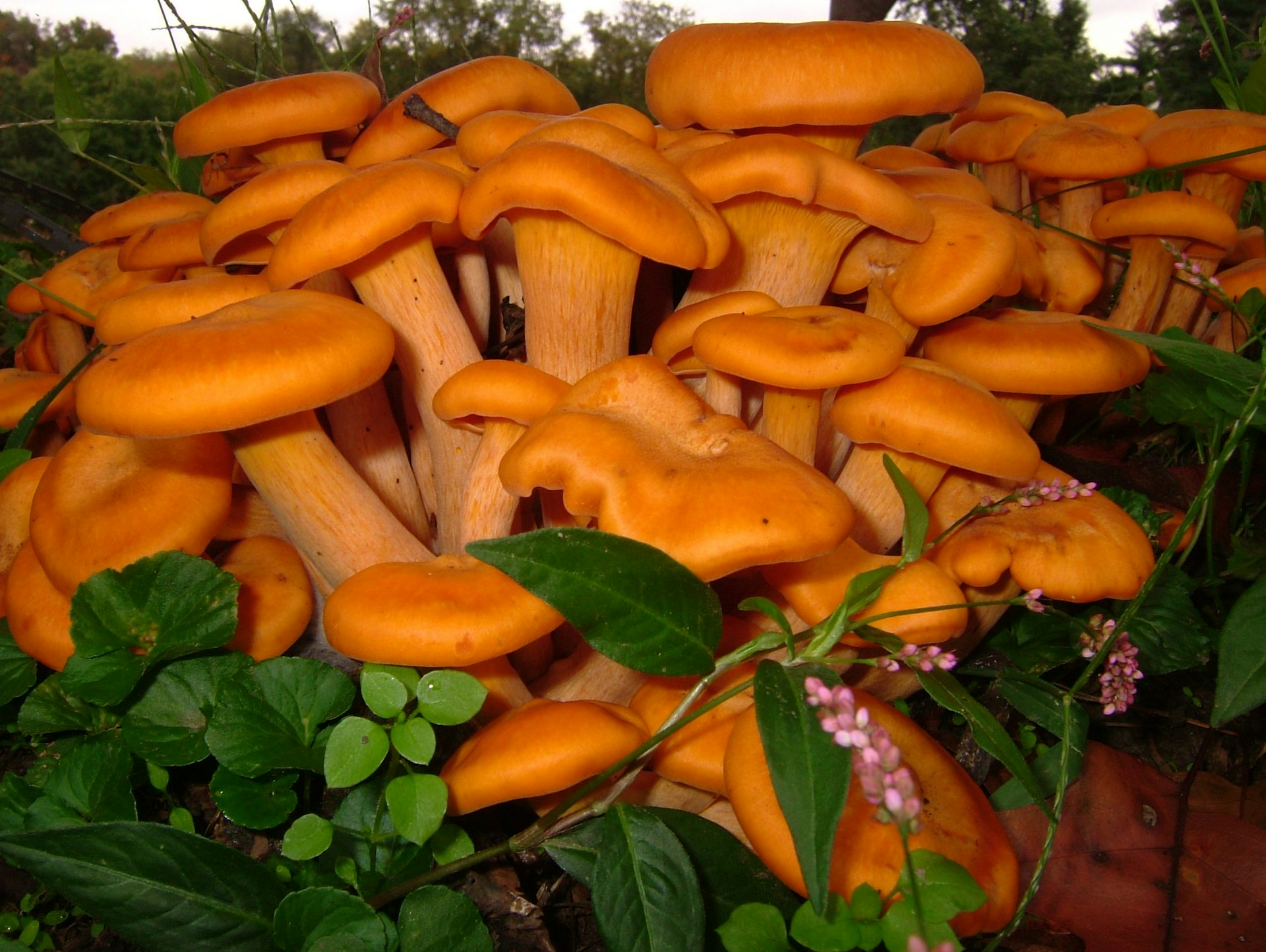 L’espèce que vous avez peut-être déjà trouvé dans votre jardin, Omphalotus illudens (ou encore O. olearius dans le sud de la France) est remarquable à plus d’un titre. D’abord, parce qu’elle est toxique : ne vous fiez pas à sa belle couleur orangée et son odeur suave de sous-bois. Ensuite, parce qu’elle émet une lumière verte depuis ses lames, bien visible dans le noir complet. Ce phénomène est observable à l’œil nu si l’on s’éloigne des sources lumineuses parasites.