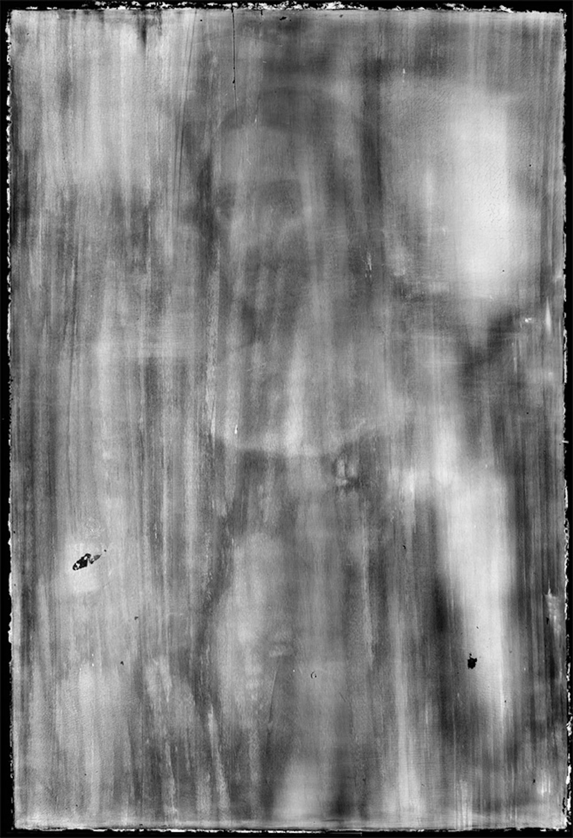 J’ai illustré cela avec la Belle Ferronnière, de Léonard de Vinci. On y voit les stries du bois de noyer, caractéristiques du support ; les stries transversales correspondant aux coups de pinceau de la préparation, destinée à régulariser la surface du support ; puis la couche picturale, reconnaissable par la forme du portrait et fortement influencée par la nature des pigments. Les carnations, en particulier, apparaissent très marquées en radiographie car elles contiennent un pigment utilisé depuis l’Antiquité jusqu’à la fin du XIXe ou le début XXe siècle : le blanc de plomb. Le plomb arrête fortement les rayons X, ce qui rend ces zones très lisibles.