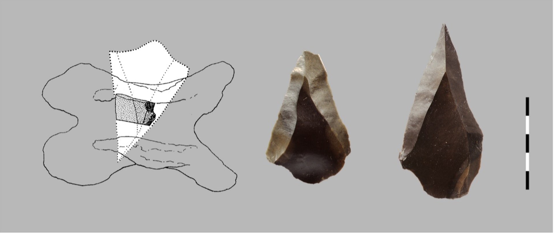 En retournant à la bibliographie et à nos propres travaux sur des outillages du Paléolithique moyen, nous avons constaté que la présence dans un même ensemble d’armatures de divers types, pour partie microlithiques et produites à cette fin, n’était à ce jour connue que dans les sites à Homo Sapiens. Les plus anciennes occurrences documentées sont en Afrique du Sud dans les couches culturelles Pre-Still Bay (plus de 77 000 ans) et postérieures du gisement de Sibudu. Dans l’univers néanderthalien, les pointes lithiques endommagées par un usage en armature de projectile sont rares, elles sont de fort gabarit et ne se distinguent ni par leurs dimensions, leur facture ou leur type de celles employées à d’autres activités que la chasse, telles que la collecte de végétaux ou la boucherie. Cette distinction dans la conception des outillages et des armements prend valeur de marqueur anthropologique.